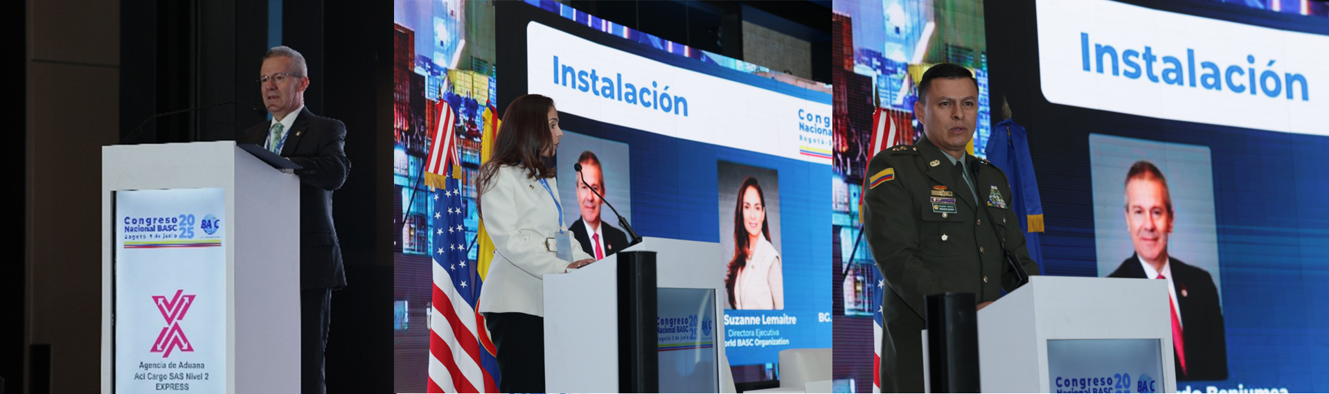 La instalación oficial del Congreso estuvo a cargo de la Orquesta Sinfónica de la Policía Nacional, quienes entonaron el Himno Nacional de Colombia y rindieron un minuto de silencio como acto de respeto y memoria por quienes han ofrendado su vida al servicio del país. Seguido a esto las palabras de bienvenida estuvieron a cargo del Sr. Luis Bernardo Benjumea, Director Ejecutivo de BASC Colombia; la Sra. Suzanne Lemaitre, Directora Ejecutiva de World BASC Organization y del Sr. Brigadier General Wharlinton Iván Gualdrón, Jefe Nacional de Servicio de la Policía Nacional de Colombia; quienes en sus palabras inaugurales coincidieron en la necesidad de articular esfuerzos entre el sector público y privado para gestionar adecuadamente los riesgos y amenazas transnacionales que afectan la seguridad de la cadena de suministro internacional.