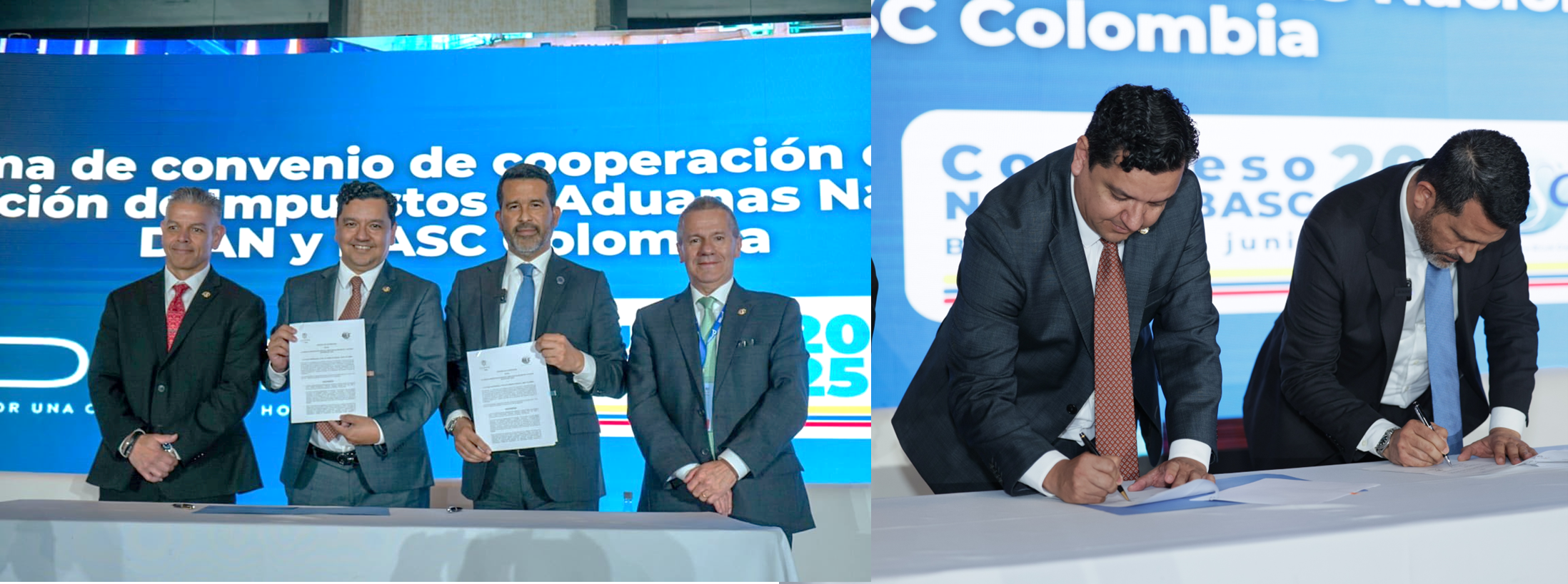 El convenio fue suscrito por el Sr. Óscar Sánchez, Presidente de la Junta Directiva de BASC Colombia, y el Dr. Luis Eduardo Llinás, Director Encargado de la DIAN. El acto estuvo acompañado por el Sr. Erik Moncayo, Presidente Internacional de la World BASC Organization (WBO), y el Sr. Luis Bernardo Benjumea, Director Ejecutivo de BASC Colombia, quienes respaldaron esta alianza como un ejemplo concreto de articulación público-privada en pro de un comercio exterior más seguro.