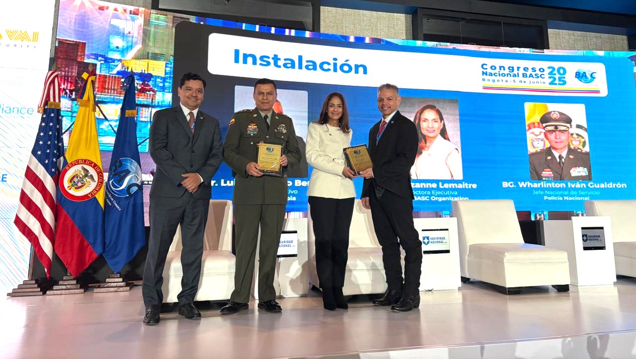 Después del acto de instalación, el Sr. Óscar Sánchez León, Presidente de la Junta Directiva de World BASC Organization y BASC Colombia hizo entrega de un reconocimiento al Sr. Brigadier General Wharlinton Iván Gualdrón, Jefe Nacional de Servicio de la Policía Nacional de Colombia; y el Sr. Erik Moncayo, Presidente Internacional de World BASC Organization; hizo entrega del reconocimiento a la Sra. Suzanne Lemaitre, Directora Ejecutiva de WBO, por su liderazgo y contribución a la promoción de un comercio internacional más seguro.