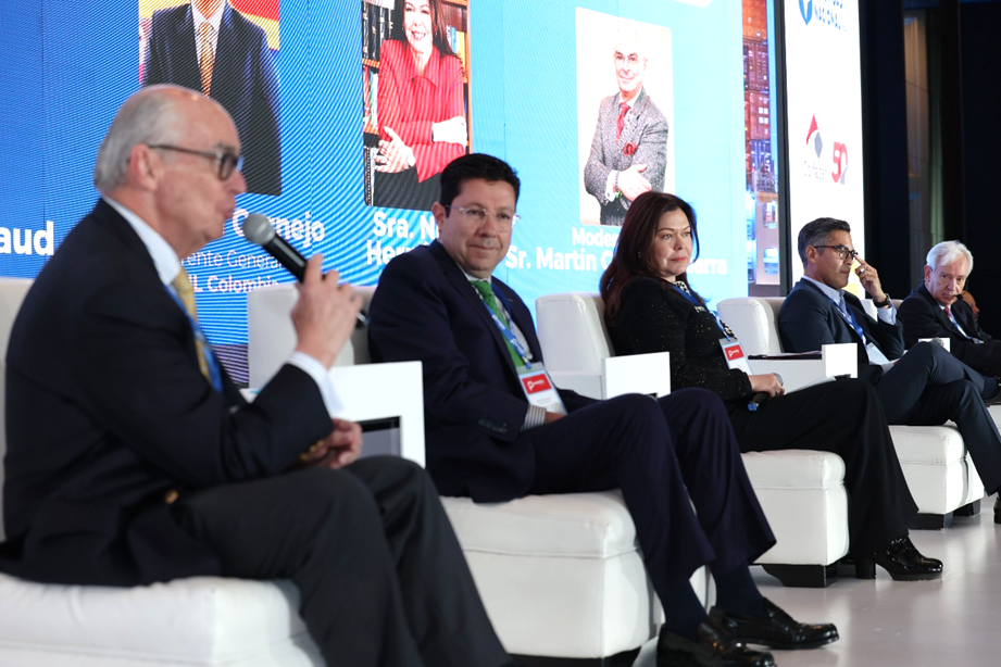 Posteriormente la agenda continuó con el panel “La seguridad en la cadena de suministro: un compromiso transversal de todos los sectores económicos”, en el que se destacó cómo las empresas colombianas están asumiendo este reto con acciones concretas en sus operaciones logísticas y comerciales. El panel estuvo moderado por el Dr. Martín Gustavo Ibarra, CEO de Araujo Ibarra & Asociados y contó con la participación del Dr. Diego Vargas, gerente general de Zona Franca de Bogotá; el Dr. Georges Bernard Bougaud, presidente de Recamier; el Dr. Allan Cornejo, gerente general de DHL Colombia; y la Dra. Nidia Hernández, presidenta de Colfecar. Cada uno compartió experiencias desde sus sectores —industria, transporte, generadores de carga y logística—, coincidiendo en que la sostenibilidad y la seguridad no son esfuerzos aislados, sino pilares estratégicos integrados en la gestión y al avance del País.
